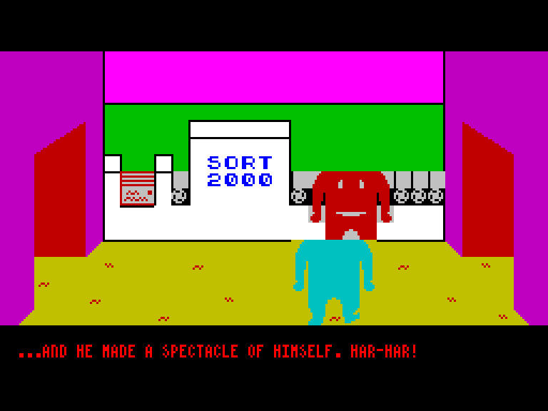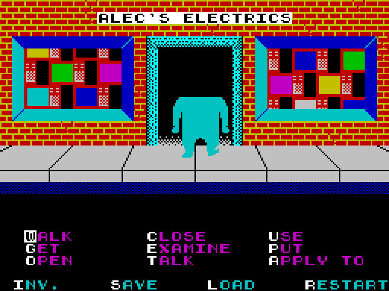 Перемещается курсор тоже с помощью синклер-джойстика, но клавишей выбора действия почему-то назначена Enter, а не привычная «0». И если это несложно починить, то что делать с разросшимся списком глаголов, большинство из которых можно без проблем заменить на обычное «Использовать»? Зато с чувством юмора у товарища всё в порядке — к примеру, в игре есть тёмная аллея, где ни черта не видно, и только какой-то странный товарищ предлагает главному герою всякие гадости: то посмотреть на труп, то купить наркотики, то обзавестись Commodore 64.