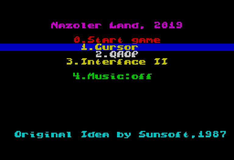 Версия Дмитрия называется Nazoler Land и, по утверждению автора, немного отличается от оригинала, хотя выглядит очень похоже. Скачать игру можно с нашего сайта или с форума «Кодинг для Спектрум и 8бит». Туда же следует писать об ошибках и глюках, если такие найдутся.