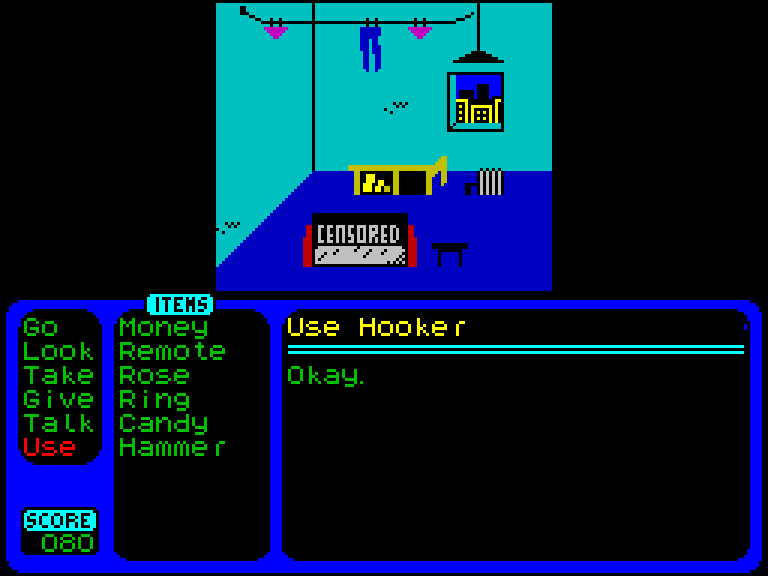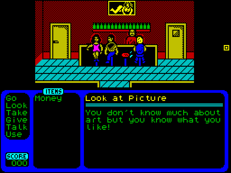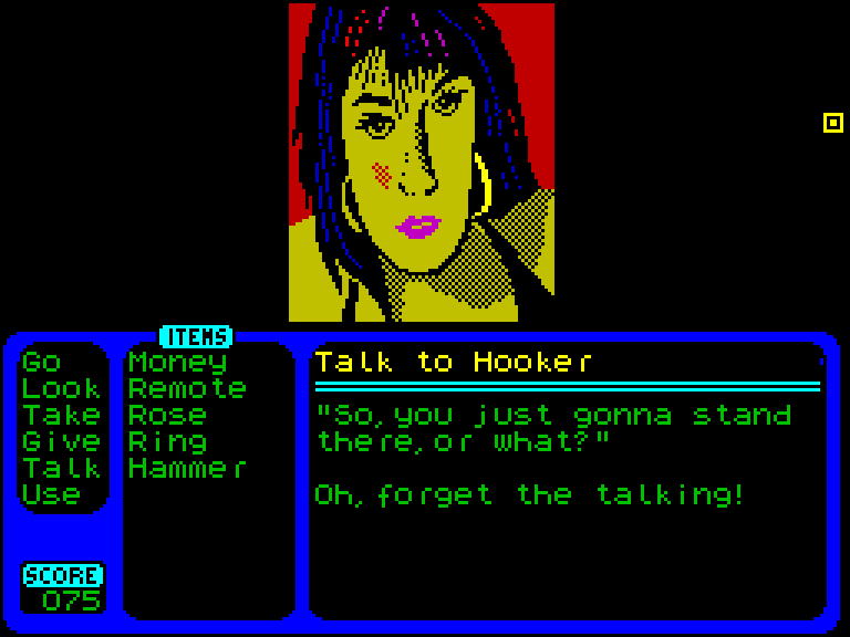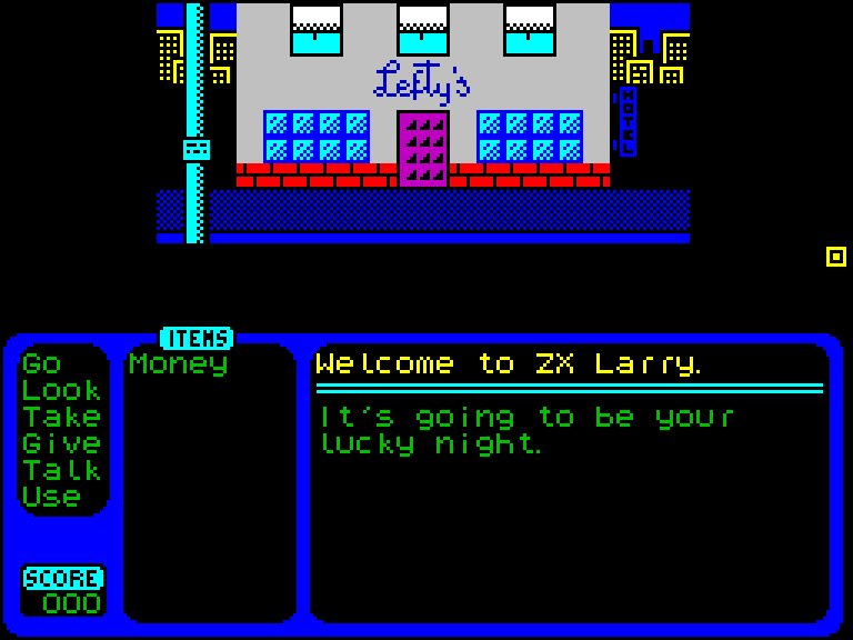 Удивительно, но ZX Larry — это всё ещё графический квест, только без расхаживающего по экрану главного героя. Курсор имеется (управляется он как с клавиатуры, так и при помощи Kempston-мыши), а вот Ларри явно находится где-то за экраном. Что ж, так даже проще ассоциировать себя с главным героем, если кому-то такое придёт в голову. Взаимодействие с окружающим миром здесь осуществляется так: сначала нужно выбрать глагол (Take, Look, Go и так далее), а потом применить его на персонажа или другой предмет. Здесь, кстати, имеется простор для улучшения — можно повесить основные глаголы на соответствующие клавиши (T, L, G...), и играть будет куда проще.
