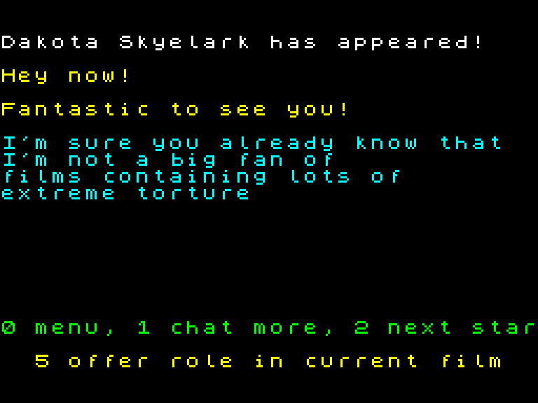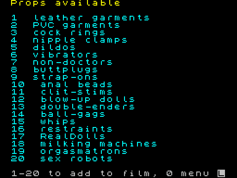 Симулятор продюсера порно-фильмов — нужно выбирать темы и реквизит для своих шедевров, нанимать звёзд и малоизвестных актрис (или актёров), а после съёмок надеяться на признание профильных изданий. На пиксельную эротику можно не надеяться — игра целиком текстовая и не очень шустрая. Зато имена местных знаменитостей с небольшими изменениями взяты из реальной жизни, а автор явно знает толк в извращениях, судя по богатому порно-словарному запасу.