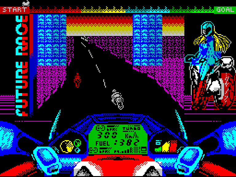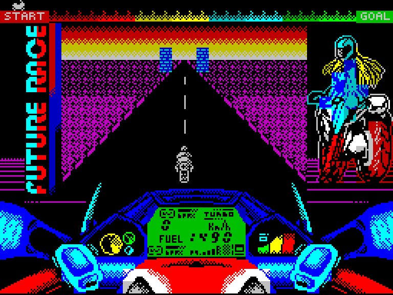 Гонка на мотоцикле с неплохой для Бейсика графикой, но с низкой частотой кадров. На удивление, играть всё-таки можно, хотя, чтобы доехать до финиша, вам потребуется невероятная усидчивость.