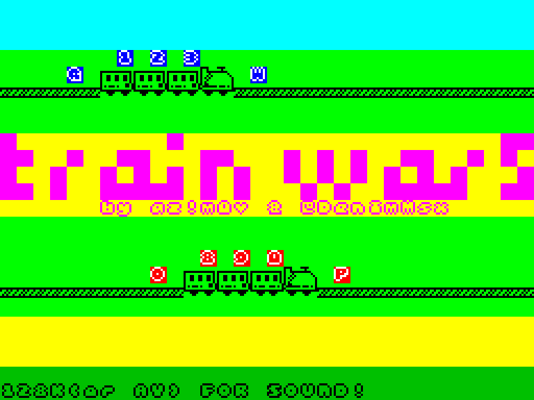 По бесконечным путям мчатся два поезда и стреляют друг в друга из какого-то мощного оружия. Первый управляется клавишами Q, W, 1, 2 и 3, а второй — O, P, 8, 9 и 0. Увы, компьютерного оппонента в Train Wars нет, зато имеется звук паровоза для компьютеров, оснащённых AY-чипом.