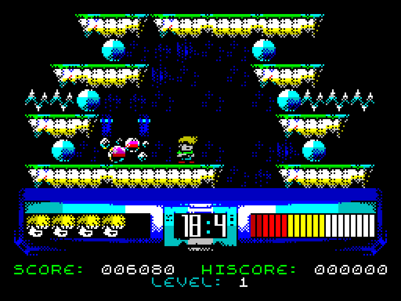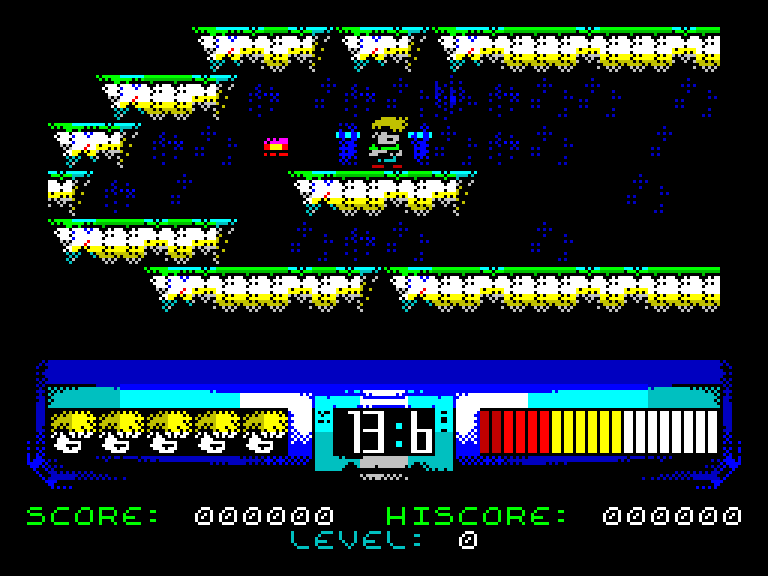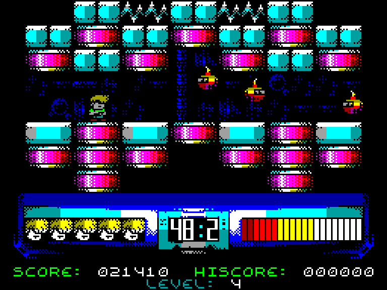 Alone Coder: Сначала была мысль сделать что-то типа Rick Dangerous, но по мере исчерпания времени до дедлайна запланированные фичи исчезали — лифты, лестницы, скроллинг, передние планы... Сосульки превратились в капли слизи, а траектории у врагов остались самые простые. А там и 48K-память кончилась. Приходится чем-то жертвовать!