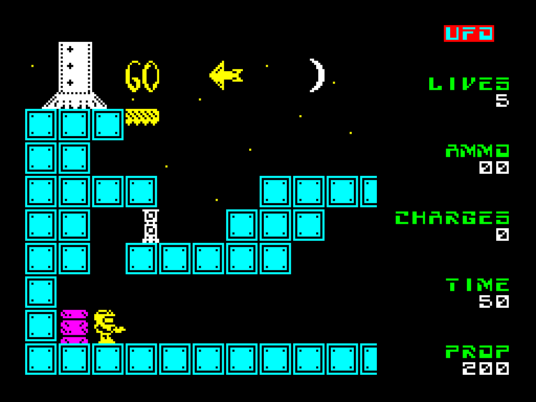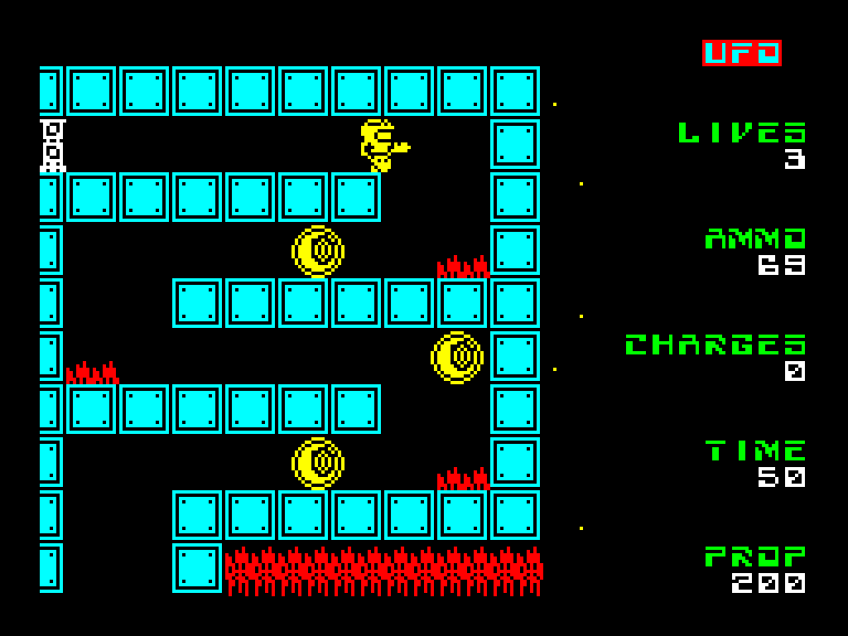 Уйдя от древнеегипетской тематики, наш разработчик подался в научную фантастику — новая игра называется UFO и является не столько платформером, сколько клоном Cybernoid. Здесь вы тоже летаете по разным экранам (правда, на джетпаке), стараетесь не столкнуться с врагами, по возможности уничтожаете их, а главное — собираете заряды, чтобы активировать бомбу и взорвать станцию пришельцев, которая угрожает Земле.