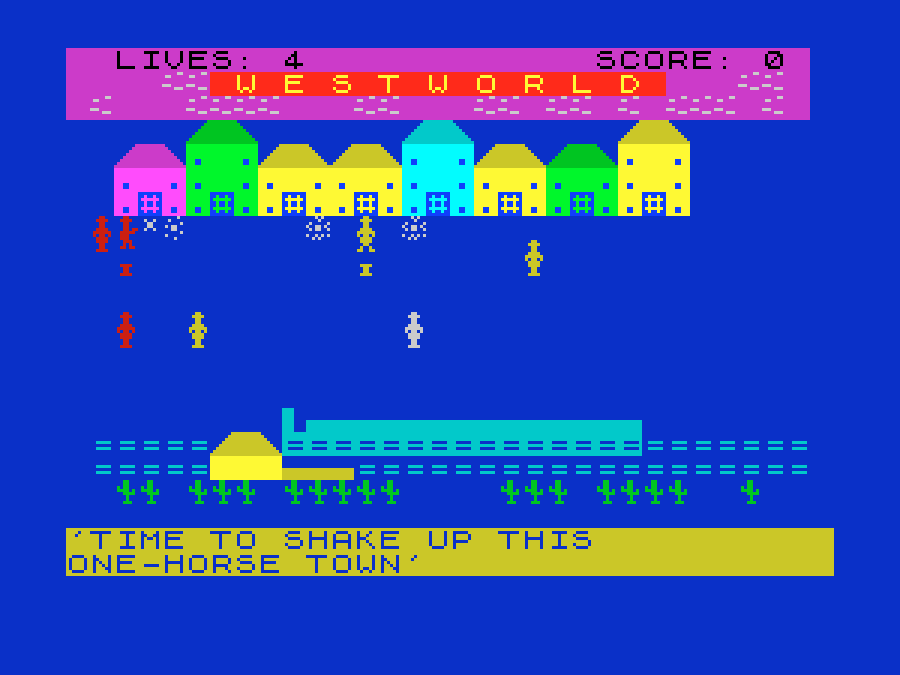 W E S T W O R L D (сайт) — не самая лучшая игра, но не отметить её было невозможно, поскольку это своего рода адаптация известного сериала «Мир Дикого Запада». Выглядит как минимум забавно, а игровой процесс состоит в том, что нужно ходить по экрану и защищать мирных жителей от бандитов (то есть жёлтых человечков — от красных).