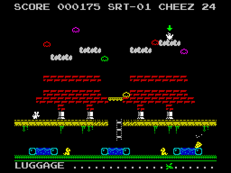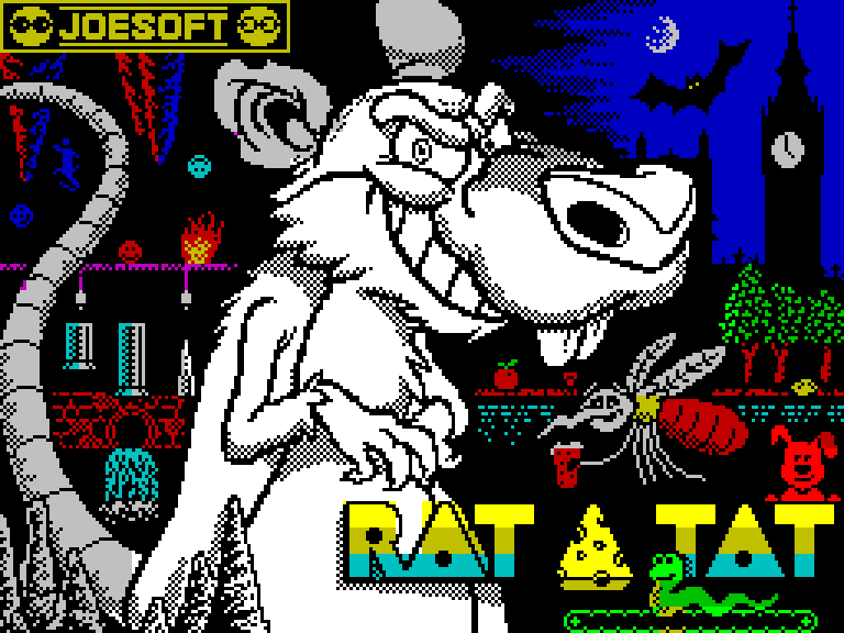 Rat-a-Tat — простенький, но симпатичный платформер на движке AGDx Mini+, который оперирует спрайтами размером с одно знакоместо. Создал эту радость Джон Дэйвис, а красивый загрузочный экран нарисовал безумно продуктивный Энди Грин.