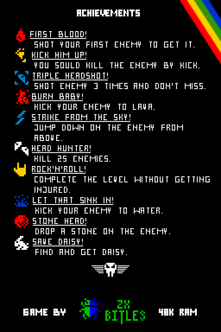 Когда я проникся этой идеей, смех закончился. Дорогой читатель, я понимаю твоё негодование при прочтении этой лирики. Всё, что я хотел сказать, это то, что мне 40 лет, и я в этом году впервые увидел ZX Spectrum, написал музыку для игры, придумал хитрые уровни и сделал всё, что было в моих силах, чтобы ты мог сказать: «В эту игру хочется играть!»