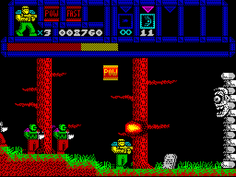 В результате этого «сочетания скуки и бессонницы из-за попыток разобраться в странной раскладке спектрумовского экрана» родилась отличная стрелялка Hell Yeah! в лучших традициях то ли испанских релизов от Dinamic Software (например, Astro Marine Corps), то ли шедевров Дэйва Перри и Ника Брути (Savage и не только). Проще говоря, игра может похвастаться красочной графикой, познакоместным скроллингом, минимальным клэшингом атрибутов и очень бодрым геймплеем.