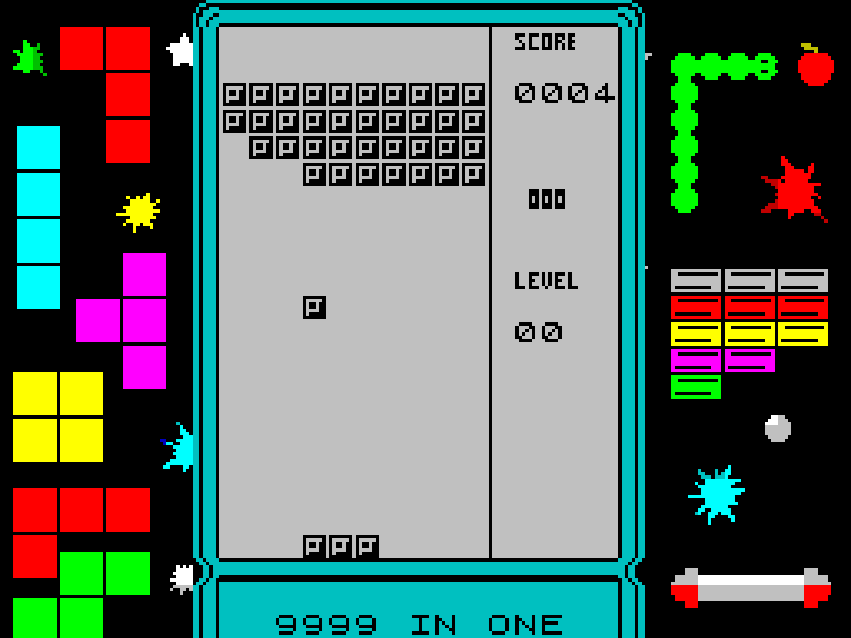 Как и положено продуктивному человеку, свою ностальгию некто Gusman пустил на полезное дело: изготовил игру для ZX Spectum. Называется она 9999 in 1 и, конечно, страшно лукавит уже на этой стадии, ведь игр всего восемь: «Тетрис», «Змейка», «Арканоид», гонки и так далее. Впрочем, это как раз по канону — практически ни в одну из подобных электронных безделушек не помещалось заявленное количество игр, поэтому они просто бесконечно повторялись.