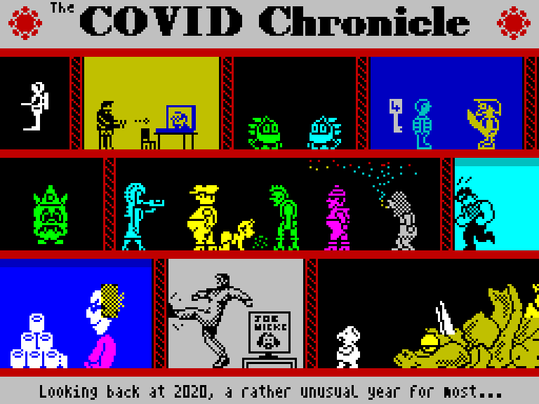 Помимо этого, в журнале хватает рецензий и прочих текстов. Есть и отдельные приложения: например, Desert Island Tapes – список кассет и прочих вещей, которые взяли бы с собой на необитаемый остров спектрумисты разной известности. Или Covid Chronicle — юмористический, насколько это возможно, рассказ про коронавирусный 2020 год. Сборник всякой графики Woot! 2020 Slideshow тоже интересен само по себе, в отрыве от журнала.