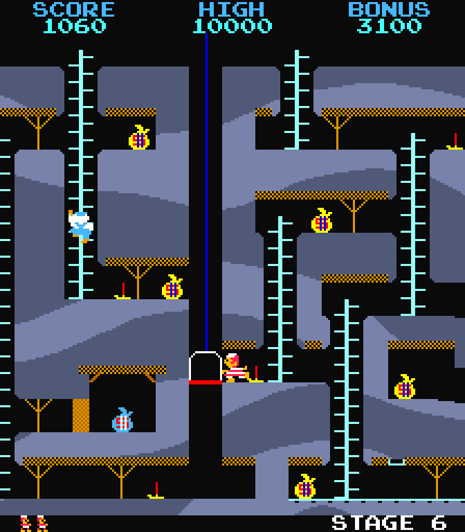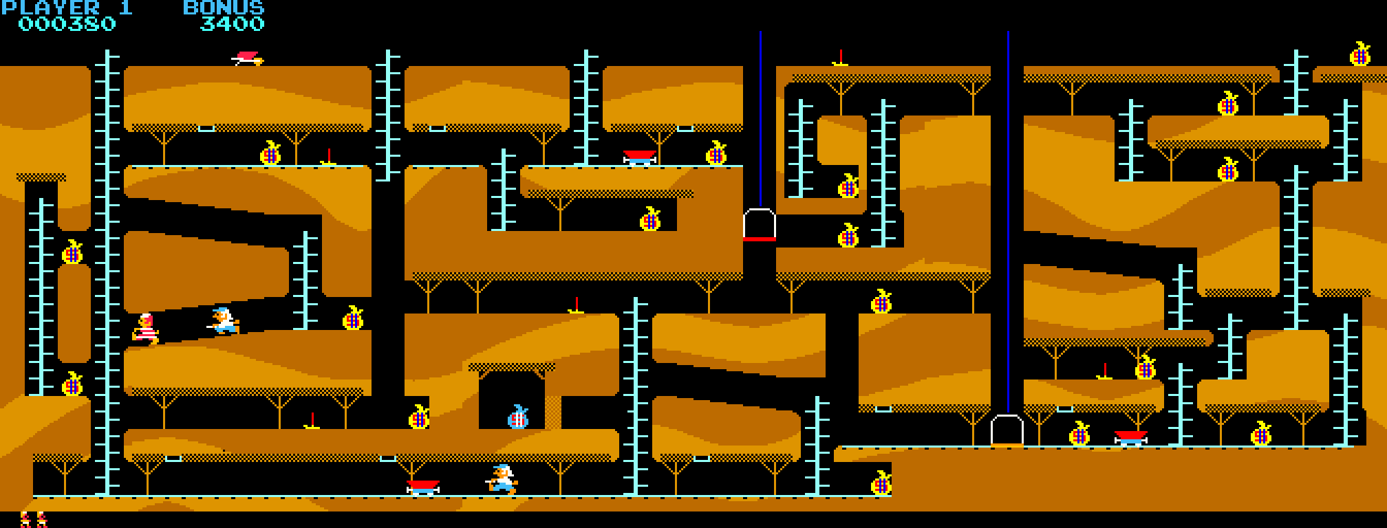 Версия французского программиста под ником JOTD, напротив, довольно точно повторяет оригинал — неудивительно, ведь товарищ просто-напросто его дизассемблировал, позаимствовав оттуда всю игровую логику. Собственно, поэтому и название осталось неизменным — просто Bagman. Правда, JOTD несколько подкорректировал график перемещений охранников и добавил режим «3 экрана», выглядящий вот так: