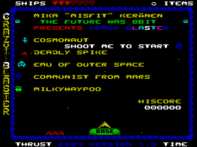 Но матёрый ретро-разработчик Мика Керанен, известный как Misfit, и вовсе бьёт по площадям. Его новая игрушка — стрелялка Crazy Blaster — вышла сразу на трёх платформах: C64, ZX Spectrum, Amstrad CPC, при этом как в цифровом виде, так и на физических носителях.