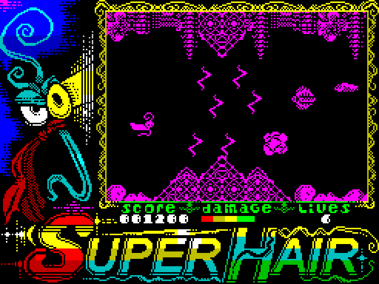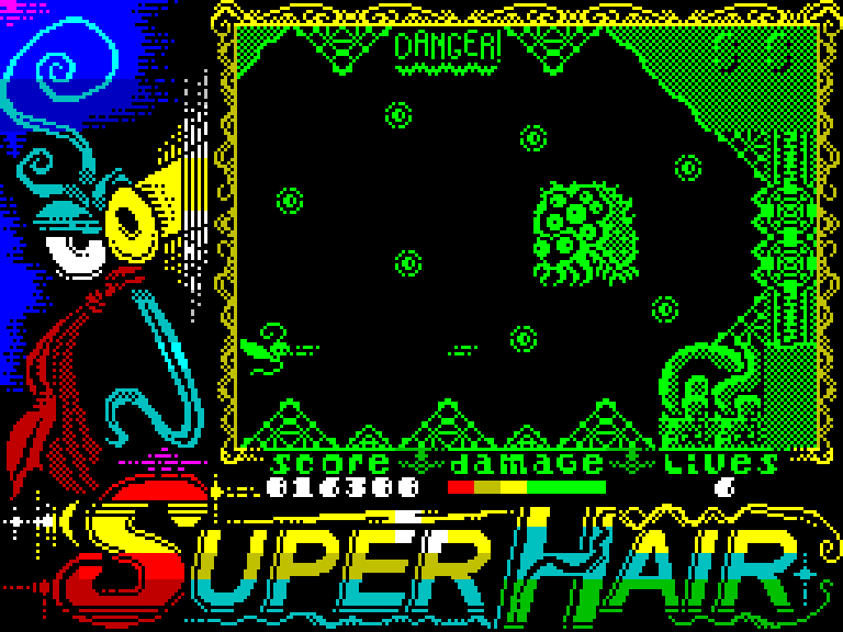 Дружественный сайт Planeta Sinclair навёл нас на горизонтальный скролл-шутер SuperHair от Ли Чопса Стивенсона, автора платформеров The Hair-Raising Adventures of Mr Hair и Mr Hair & The Fly.