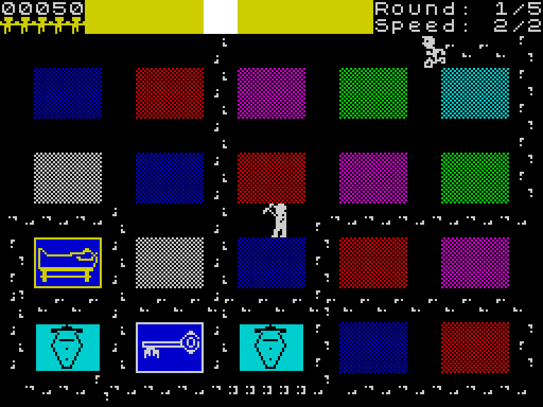 В том же году игру портировали на несколько компьютеров, включая ZX Spectrum, а через пару лет переиздали и начали включать в разные бандлы с этим компьютером. Именно поэтому кассета с Oh Mummy — одна из самых часто встречающихся для этой машины и стоит сущие копейки. К слову, выглядит игра максимально примитивно — все персонажи размером со знакоместо и перемещаются тоже по знакоместам.