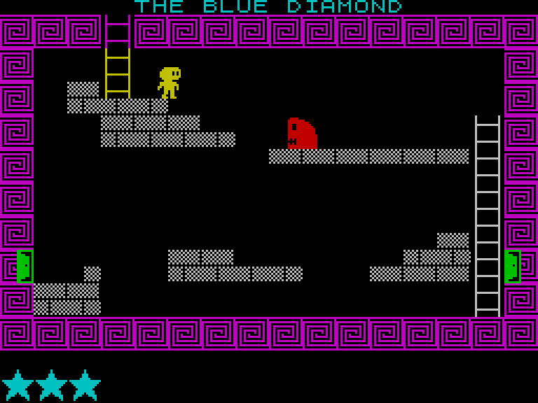 Классический платформер, в котором вам нужно добраться до огромного синего бриллианта, бегая по разным комнатам и уворачиваясь от многочисленных врагов. Из интересного — две скорости на выбор: умеренно шустрая и невыносимо медленная. Во время игры зачем-то звучит убогая версия мелодии Popcorn, и как её отключить — непонятно.