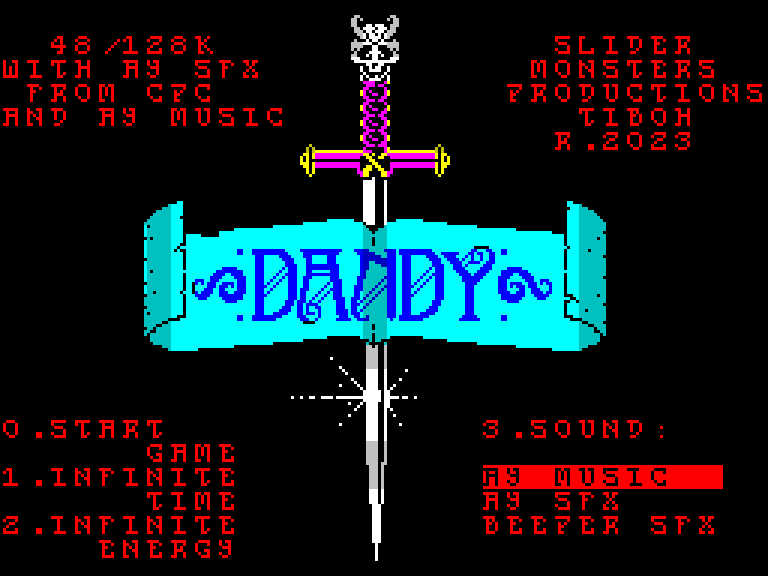 На «Спектруме» игра вышла в 1986 году и выглядела неплохо, хотя ей катастрофически не хватало нормальной музыки и вменяемого звука. Видимо, поэтому Slider, Tiboh и Monsters Productions обратили на Dandy внимание и занялись её модификацией и «дискофикацией». Вот краткий список всех улучшений в TR-DOS-релизе 2023 года: