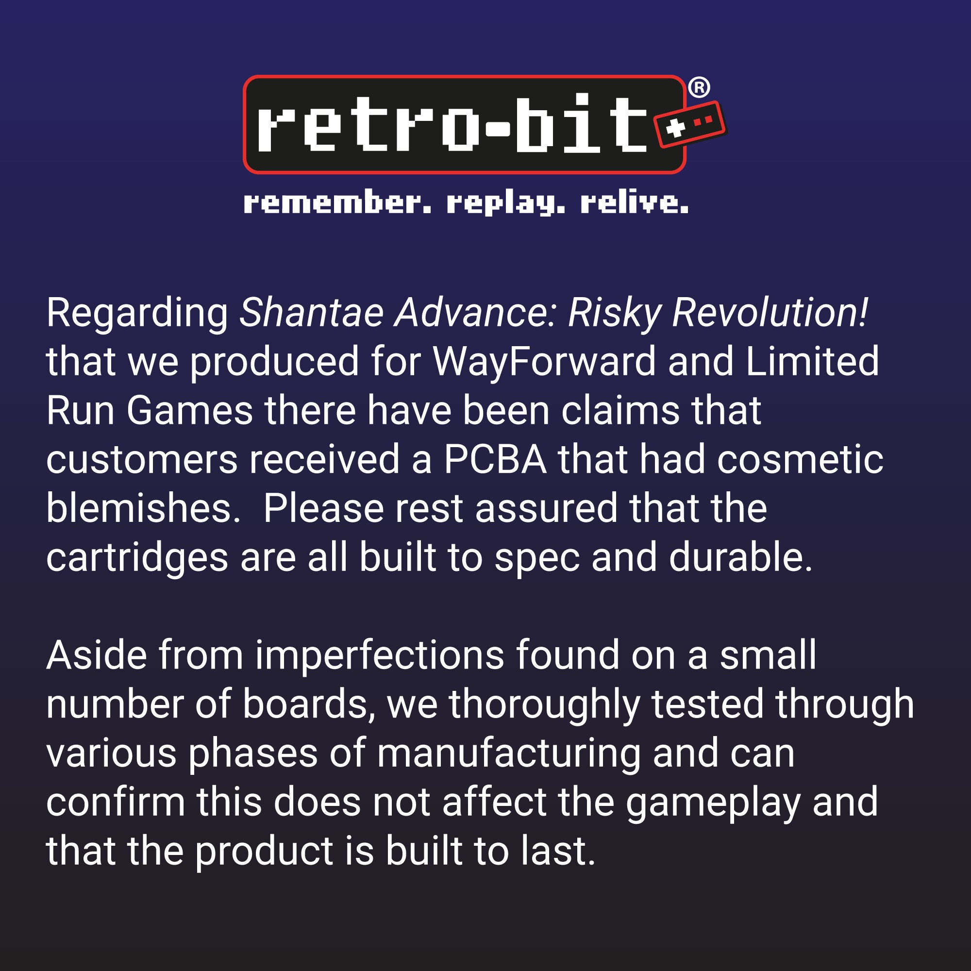 Limited Run Games, верная своим традициям, отреагировала в фирменном стиле: «Небольшие несовершенства обнаружены лишь в малом количестве плат». При этом недовольным покупателям милостиво разрешили подать заявку на замену картриджа. Интересно, там будут новые чипы или опять «слегка подержанные»?