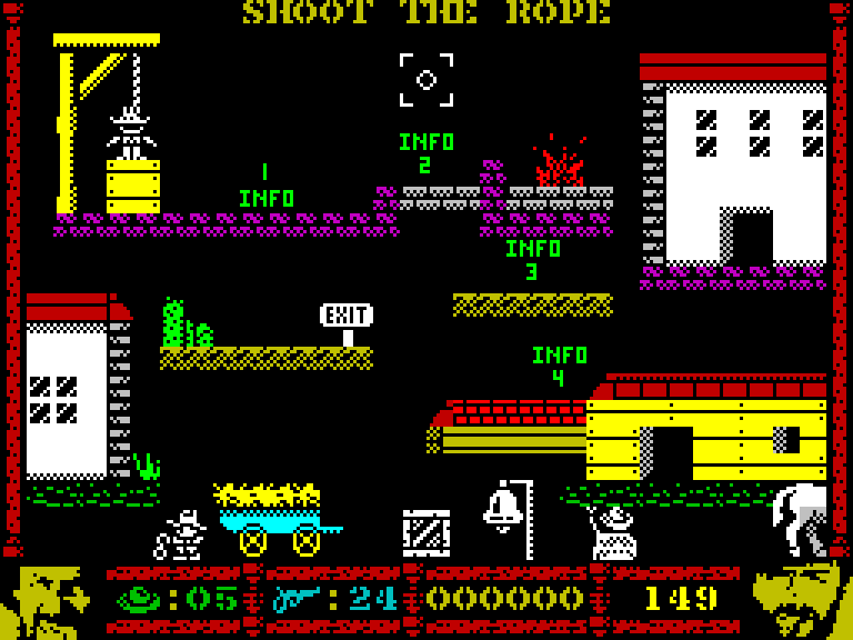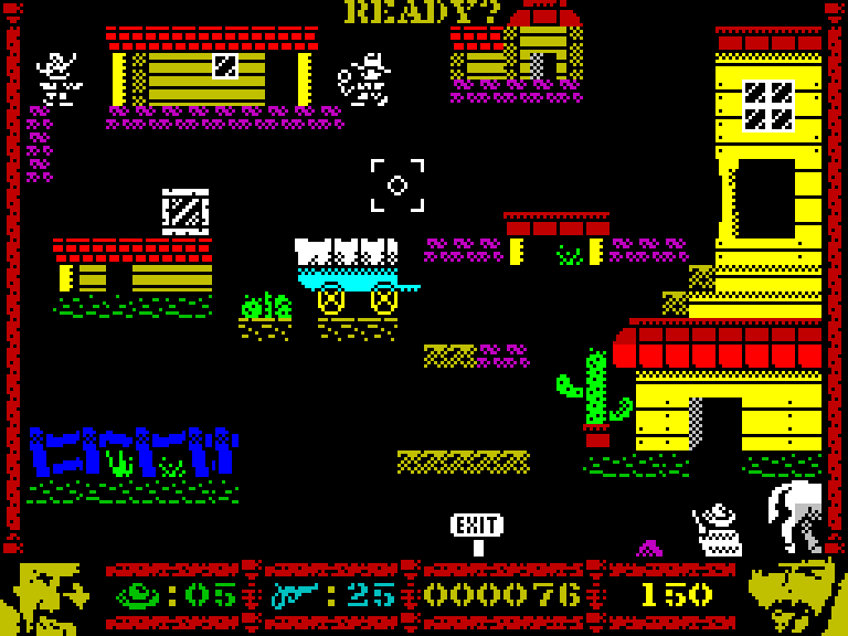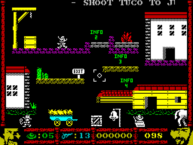 В этом типичном, если судить только по заставке, вестерне вы управляете Блондином — метким стрелком и вообще очень крутым парнем. При этом ваша задача — не прорваться сквозь толпу врагов, расстреливая всё на своём пути, а помочь своему временному напарнику по имени Туко одолеть добрые 50 уровней, метко и своевременно стреляя и бросая динамит.