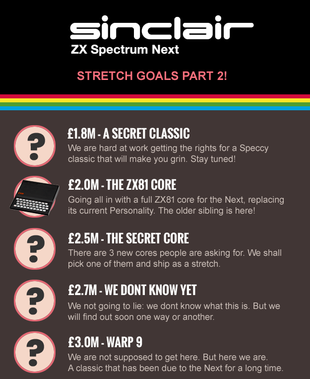 £ 2,5 млн — Секретное ядро. Народ просит реализовать в ZX Spectrum Next три новых ядра. Разработчики выберут одно из них и добавят как расширенную цель.
