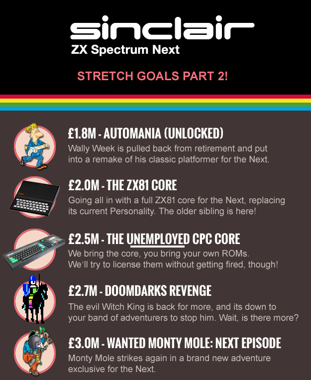 Третья кампания по сбору средств на ZX Spectrum Next входит в завершающую стадию, и команда Энрике Олиферса поделилась прогрессом по расширенным целям, которые уже разблокированы или вот-вот будут достигнуты.