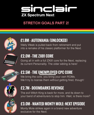 Большой интерес вызывают новые ядра для ZX Spectrum Next — уже готовые C64 и QL, а также анонсированные в качестве стретч-голов ZX81, Sam Coupé и CPC. Каждое ядро находится на своей стадии разработки, с разным набором готовых и недостающих функций. Цель — довести их до зрелости как можно скорее, желательно к моменту отправки компьютеров в конце этого года.