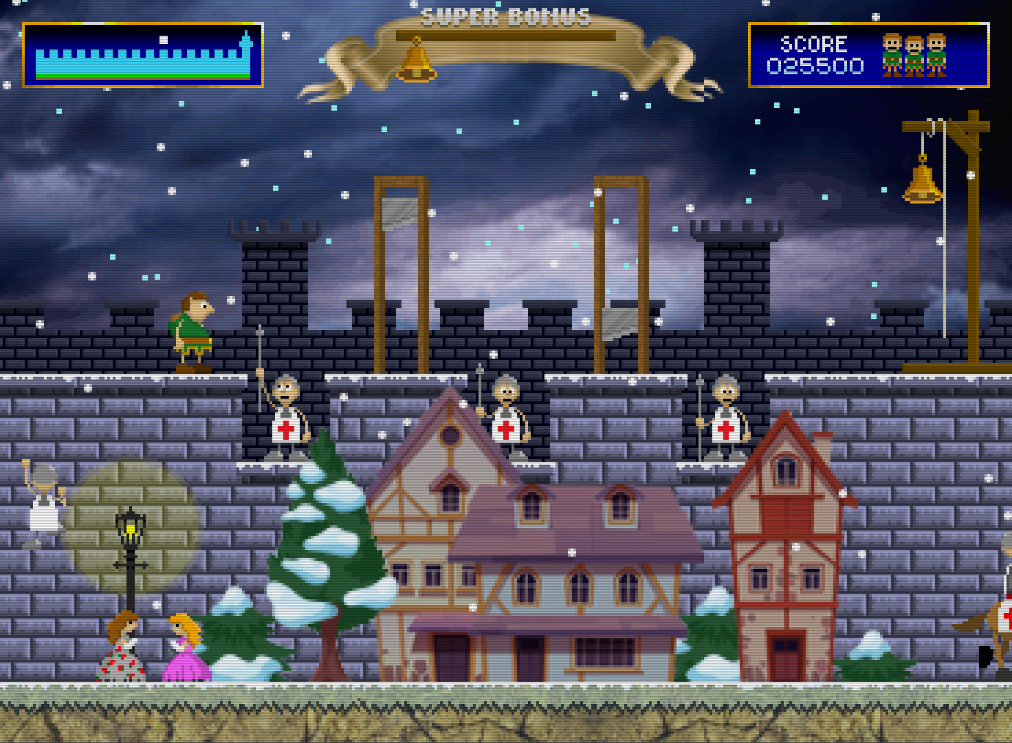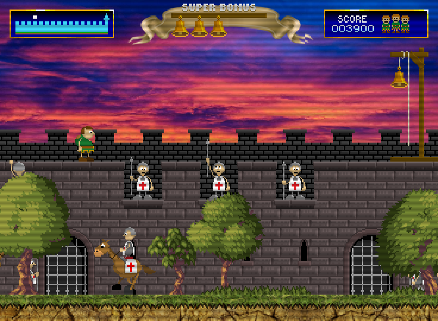 Игра называется The Hunch Refurbished, и это, разумеется, ремейк аркадной классики Hunchback. Если быть совсем точным, то Langford Productions как следует переделала (переписала с нуля и улучшила графически) свою собственную игру The Hunch, вышедшую в 2015 году.