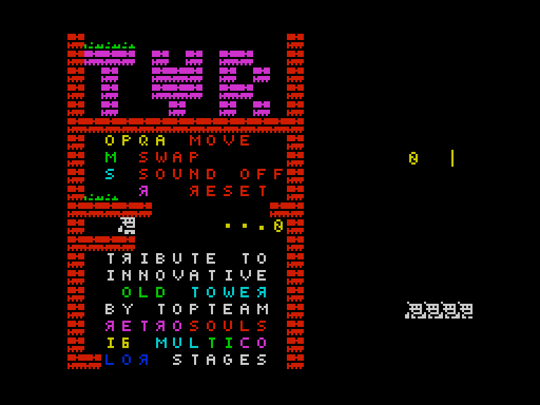Игра Old Tower, выпущенная Денисом Грачёвым в 2018 году, довольно известна среди спектрумистов. Шутка ли: Денис умудрился совместить в одном движке не только мультиколор, но и довпольно неплохой скроллинг! Ещё десять лет назад никто и не мечтал о том, чтобы на «Спектруме» выходили динамичные игры более чем с двумя цветами в одном знакоместе, а теперь это уже почти обыденность.