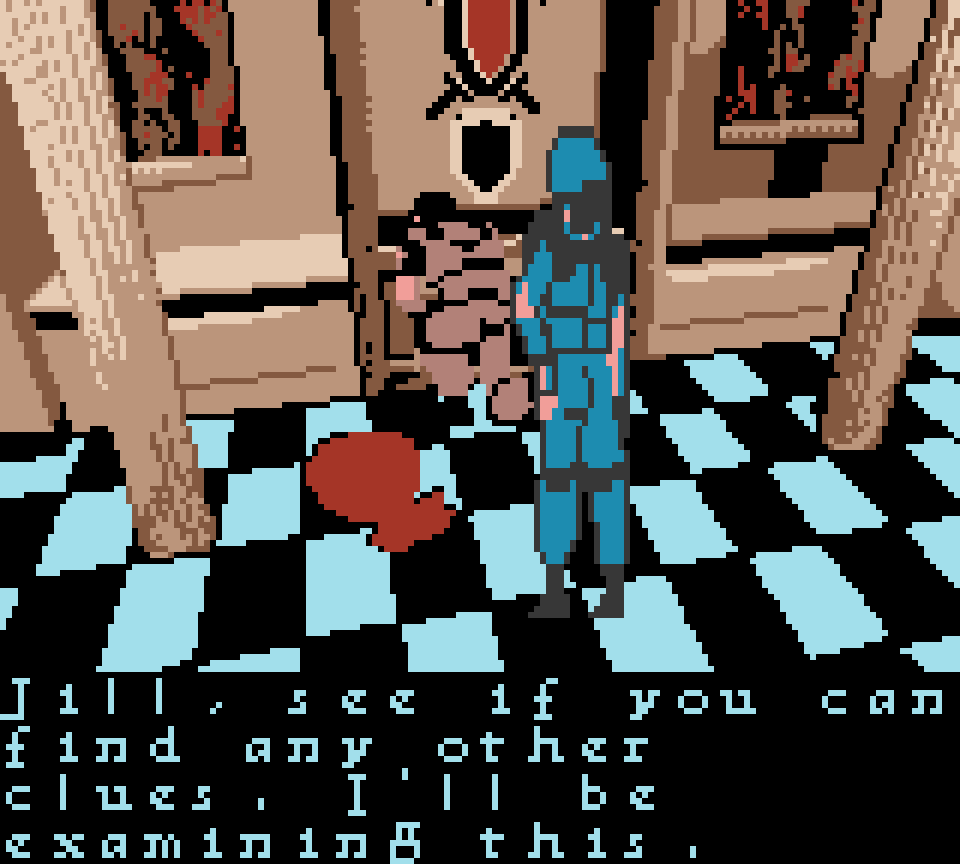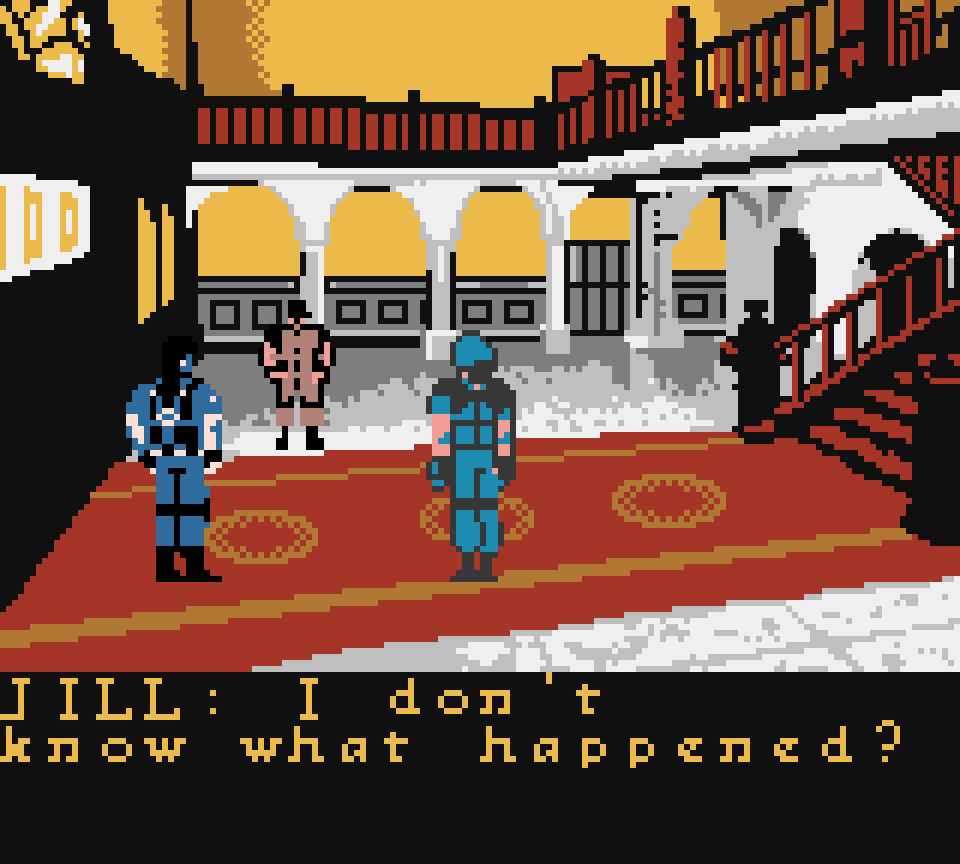 Локации, ракурсы камеры, головоломки, пререндеренные фоны, диалоги — сохранили всё. Персонажей и врагов масштабировали программно, потому что железо GBC всё это добро еле тянуло. Речь заменили текстом, но структуру игры не тронули. Спрайты для игры, кстати, рисовал знакомый многим по ZX Spectrum Саймон Батлер, музыку писал Марк Кукси — но многое банально не успели интегрировать.