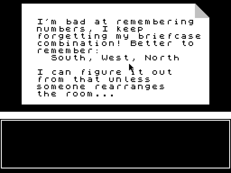 На ZX Spectrum подобных игр либо не было вообще, либо было очень мало. Пожалуй, к этому жанру можно с натяжкой отнести многочисленные текстовые квесты, но там всё-таки нужно общаться с компьютером, вводя слова на английском. А современные фанаты жанра Escape Room привыкли управлять каким-то указателем или просто тыкать в экран.