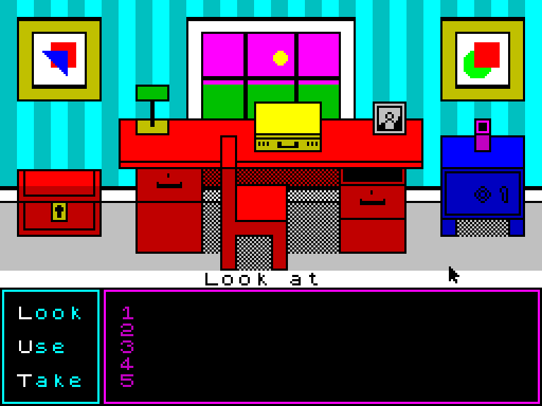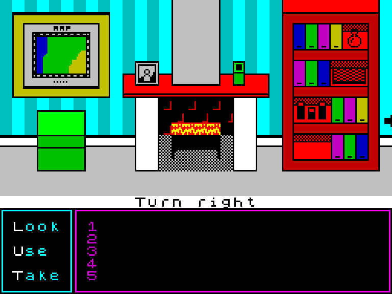 The Locked Room играется как раз по-современному: есть курсор, который управляется либо клавиатурой, либо джойстиком, либо вообще Kempston-мышью. С интерьером и предметом можно совершать три действия: Осматривать (Look), Использовать (Use) и Брать (Take). Чтобы выбрать нужное действие, надо щёлкнуть по соответствующему слову или нажать соответствующую клавишу (L, U или T).