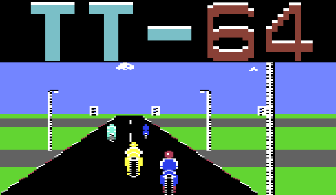 TT-64 — простая и не блещущая графическими изысками, но шустрая и довольно играбельная гонка на мотоциклах для Commodore 64.