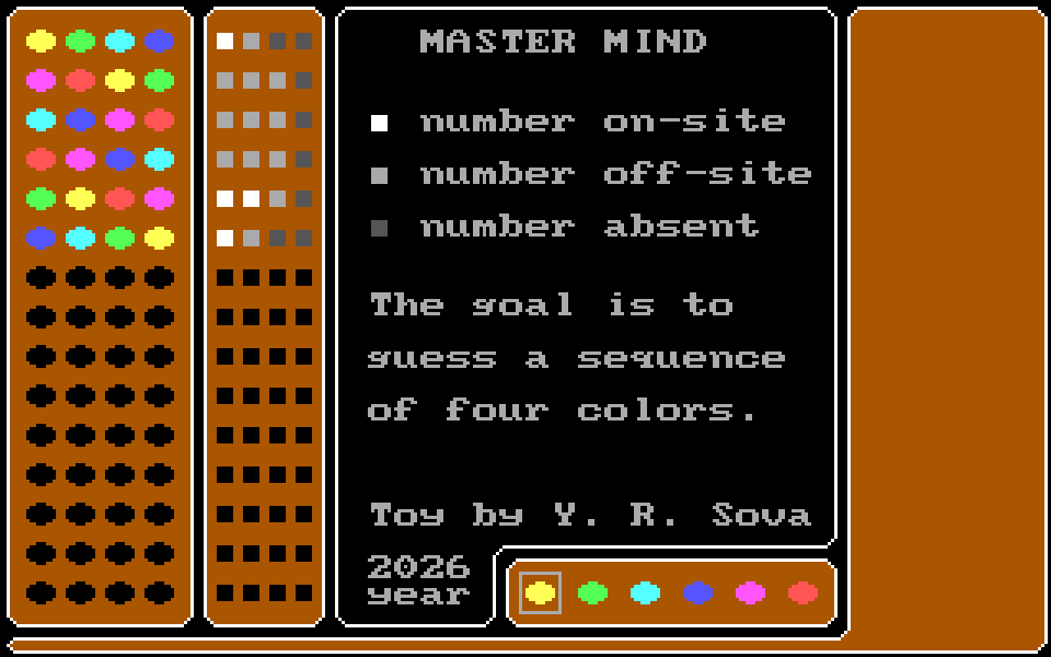 Это довольно популярная игра, один из вариантов которой известен у нас как «Быки и коровы». Конкретно в Master Mind компьютер загадывает последовательность из 4 цветов, а вы должны её угадать. Жмите цифры от 1 до 6, чтобы расставлять цветные фишки, а компьютер будет давать вам подсказки: