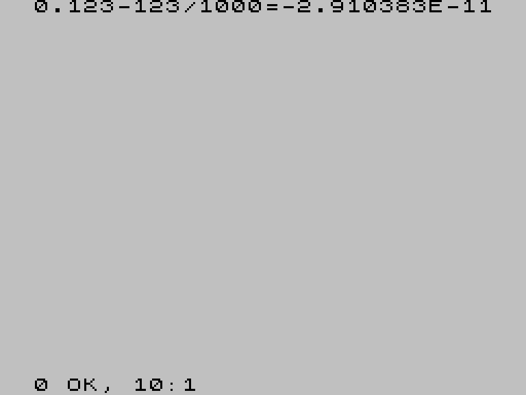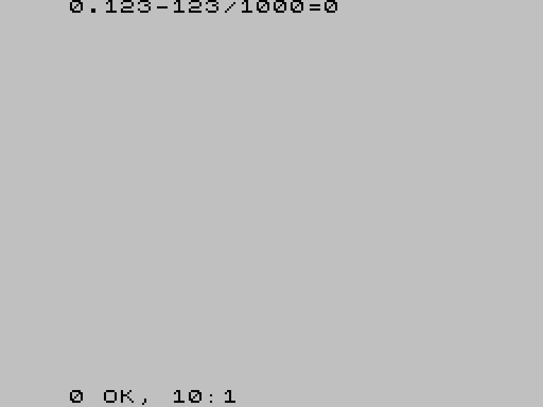 Это происходит из-за того, как оригинальный ROM обрабатывает десятичные дроби. Число 0.123 он разбирает, умножая цифры на 1/10, 1/100, 1/1000 — а эти дроби нельзя точно представить в двоичной системе. Результат накапливает микроскопические ошибки, и в итоге 0.123 хранится в памяти чуть-чуть неправильно. А вот 123/1000 вычисляется иначе, через целочисленное деление: и даёт другой результат. Именно разница между двумя «почти нулями» и порождает эту аномалию.