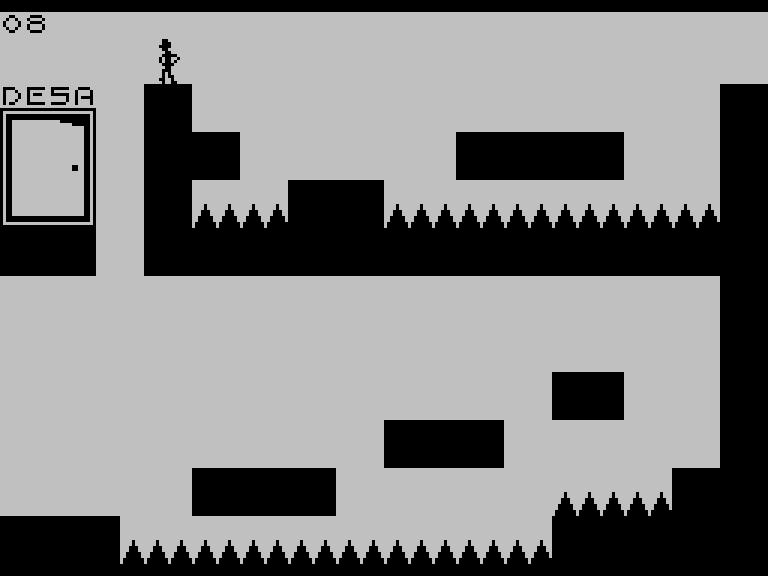 В этой головоломке вам нужно управлять схематично нарисованным человечком и на каждом экране добегать или допрыгивать до выхода, который обозначен дверью с кодом (его, кстати, можно ввести на старте, чтобы сразу попасть на нужный уровень).