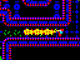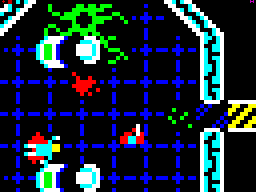 Выглядит она очень непривычно, потому что оперирует квадратиками размером 4×4 пикселя. А за счёт мультиколора в одном знакоместе могут находиться квадраты четырёх разных цветов, а не двух. Из-за этого графика в Alien Breed крупновата, зато цветаста — а это уже половина дела. Главное — что узнаются привычные по оригиналу объекты, хотя не всегда с первого раза. Но понять, где враг, а где что-то полезное, вы точно сможете.