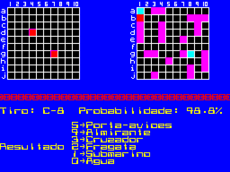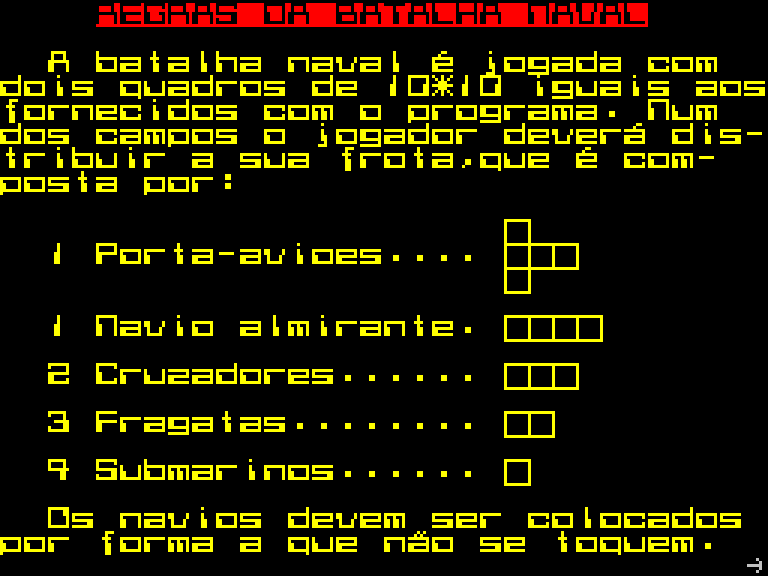 Плюс игра на португальском, так что мы выкладываем её разве что ради академического интереса. Выглядит она неплохо для, судя по всему, продукта на Бейсике, но геймплей дико неторопливый, а незнакомый язык мешает в ней как следует разобраться (а ведь, казалось бы, чего тут сложного — в «Морском бое»-то)!