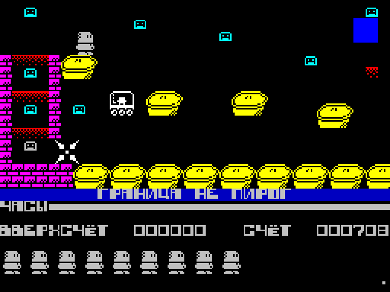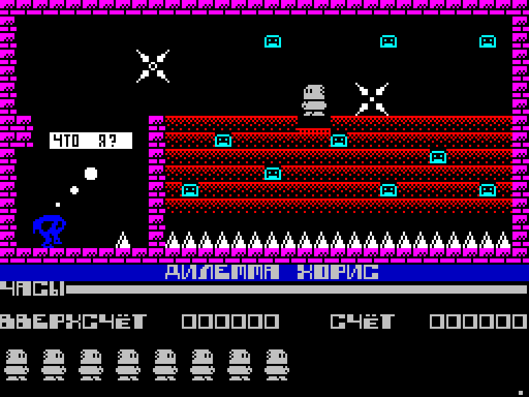 Разумеется, русский у товарища хромает, но сам факт заслуживает внимания и всяческого поощрения. Что до игры, то это стопроцентный клон Manic Miner — с таким же разделением по экранам, конвейерными лентами, шипами, зыбучими песками и злобными врагами, которых никак не победить, а можно только перепрыгнуть. Единственное отличие — здесь всего 6 экранов, поскольку это всё-таки не полноценная игра, а именно что скромный подарок всем спектрумистам.
