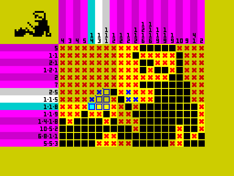Разумеется, геймплей не поменяется ни на йоту — это всё те же нонограммы (японские кроссворды), в которых зашифрованы не слова, а изображения, причём в данном случае — спектрумовской тематики. Зашифрованы они числами, расположенными слева от строк, а также сверху над столбцами. Количество чисел показывает, сколько групп закрашенных клеток находятся находятся в соответствующих строках или столбцах, а сами числа — сколько слитных клеток содержит каждая из этих групп.
