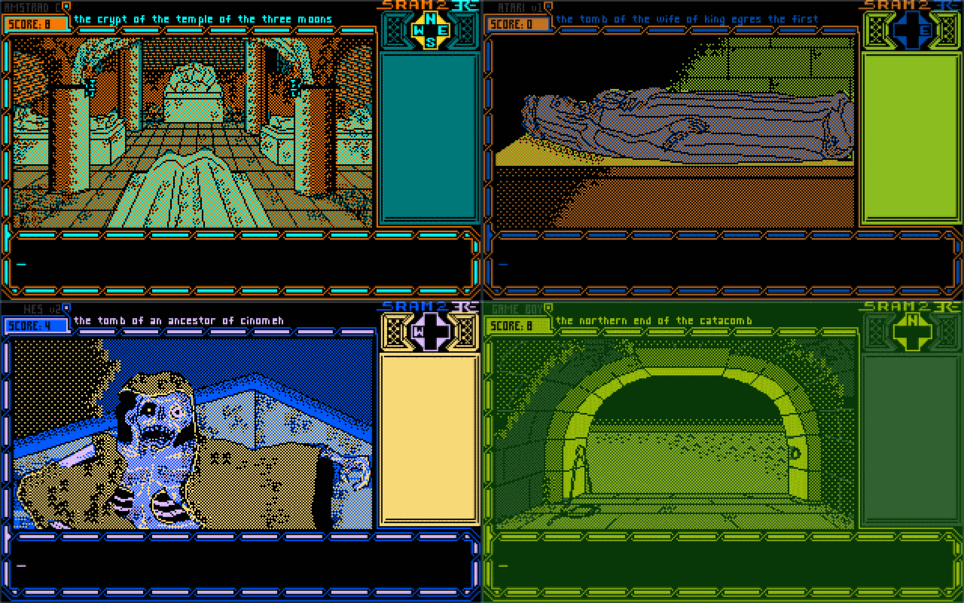 Да, квест SRAM 2 - Cinomeh's Revenge работает исключительно под Windows и Linux (хотя на macOS его можно запросто запустить через Crossover), но зато может похвастаться 31 цветовой палитрой (хотя разработчик называет их «режимами») от 15 компьютеров и консолей (на некоторые приходится сразу по несколько палитр).
