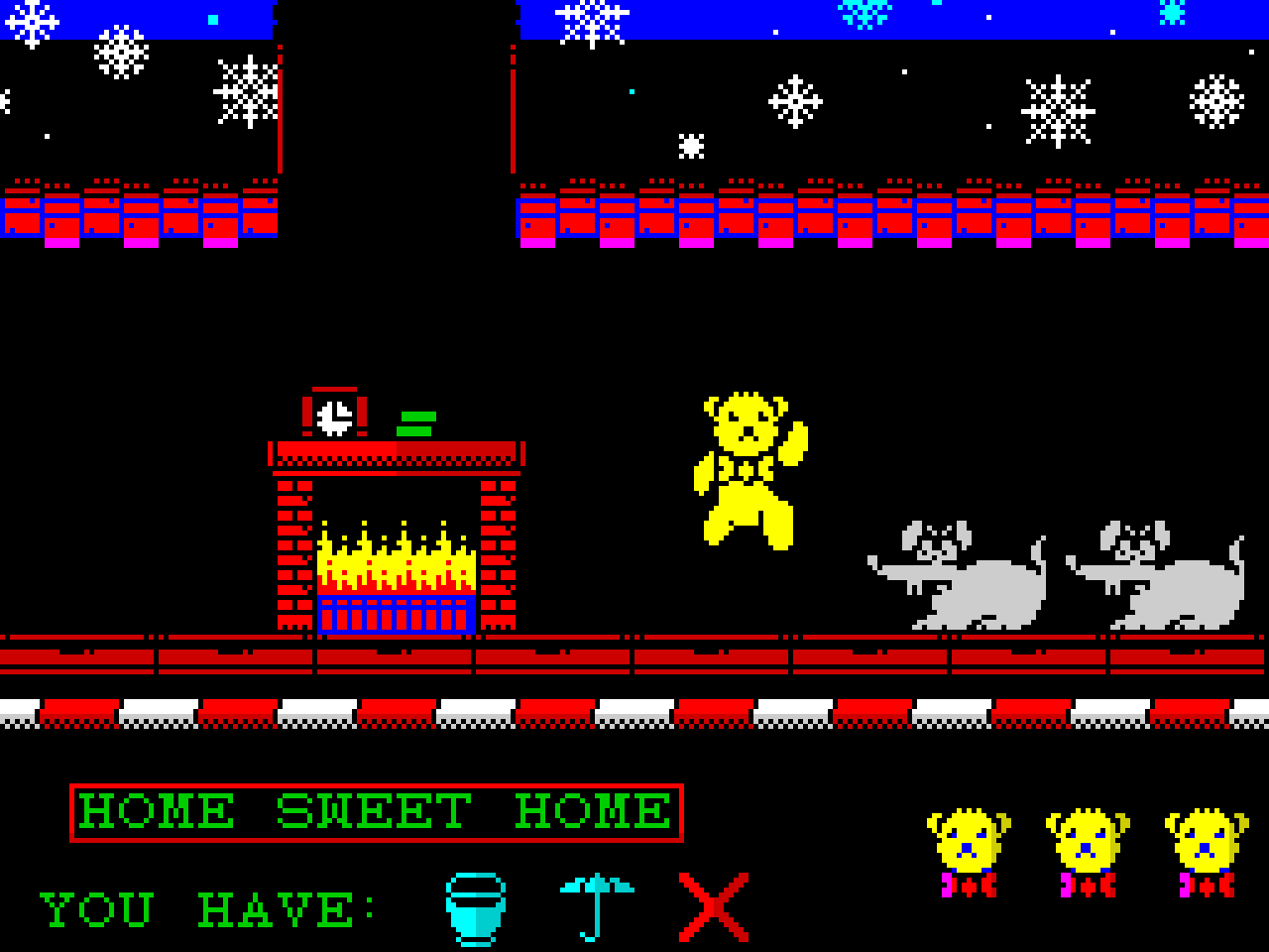 Скриншот из несуществующей британской игры родом из 80-х под названием Bearnie McSnugglepuff in: Save Our Santa! нарисовал небезызвестный нам Grongy под псевдонимом Гном Афанасий. Чего только не сделаешь в рамках @zxgfx compo #12 2026!