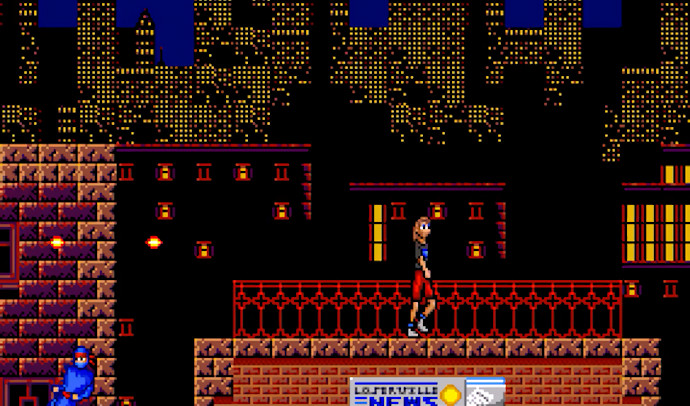 Сама же игра представляет собой платформер, герой которого бодро шагает вперёд, коллекционирует монетки, прыгает по вражинам и, по-суперменовски уперев руку в бок, отстреливает их из своего оружия. Осторожно, ещё в Tuesday встречаются динозавры! Маленькие, совсем небольшие. И громадные, от которых остаётся только бежать, бежать, бежать...