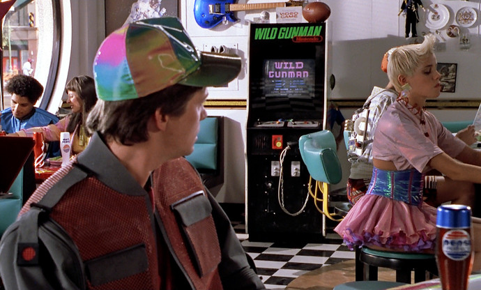 Видеоигровой автомат Wild Gunman в фильме «Назад в будущее 2», который в таком виде не производился. Кстати, один из ребят — это известный всем хоббит Элайджа Вуд: