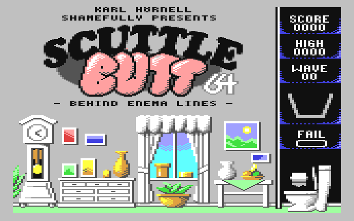 Спустя полгода вышла Scuttlebutt 64 - Behind Enema Lines — улучшенная и расширенная версия недавнего суперхита. Типов гейплея стало ровно четыре — к старому «поймай фекалию» добавились «пальни в эту задницу», «не дай нечистотам попасть на вентилятор» и «стреляй по мелким задницам, чтобы они не загадили всю квартиру». Задников (извините) стало три штуки — один краше другого. С графикой в этой игре вообще полный порядок — автор не растерял чувства стиля и грамотно воспользовался палитрой Commodore 64.
