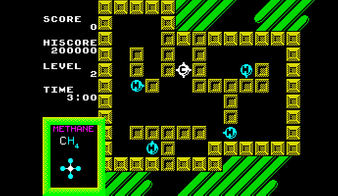 Ещё одна игра прибыла на конкурс ZX Dev MIA - Remakes — головоломка Atomix, в которой нужно собирать молекулы из отдельных атомов. Проблема в том, что атомы перемещаются не по клеткам, а строго до ближайшей стены или другого атома, так что иногда соединить все эти элементы в один очень непросто.