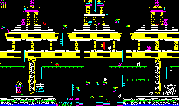 Новая программа под названием TileMap — и вовсе уникальная вещь. Она позволяет объединить сразу несколько экранов из некоторых спектрумовских игр в один, что очень сильно облегчает прохождение. Сразу видно, что там происходит на соседнем экране, где лежат какие предметы, какие поджидают опасности и так далее. Наконец, это просто очень круто выглядит — на экране порой творится такое буйство красок и одновременно движущихся объектов, что только держись. Вот, например, как выглядит в TileMap популярный платформер Dynamite Dan:
