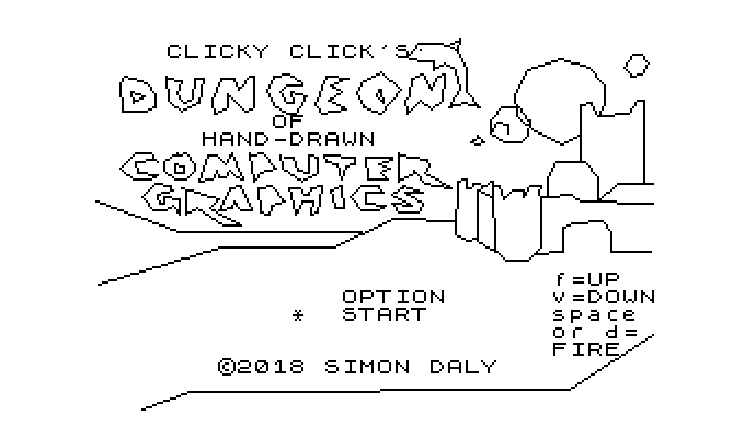 Так или примерно так начинается игра Clicky Click's Dungeon of Hand Drawn Computer Graphics — интерактивный роман с нарисованной от руки графикой и откровенно несерьёзным сюжетом. Игра вышла одновременно на трёх платформах — ZX Spectrum, Android и HTML5. Нас, разумеется, больше всего интересует первая, потому что на этом компьютере примитивная чёрно-белая графика выглядит как минимум стильно, а кое-где даже симпатично. Плюс визуализирован практически каждый экран, что для квестов и тем более интерактивных романов вообще редкость.