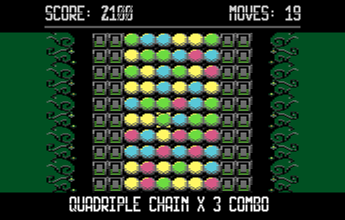 Авторы Pop'n'Drop — Войтек «Bocianu» Бочански (код) и Петр «LiSU» Лис (музыка) — явно вдохновлялись серией Candy Crush, создавая Atari-вариант подобной игры для ретрофестиваля Silly Venture 2018. Конечно, в их восьмибитном исполнении не нашлось места взрывному разнообразию вкусняшек оригинала, однако и те разноцветные кругляши, что имеются, вполне потянут на какие-нибудь мятные жевательные конфеты или покрытые глазурью шоколадки, тающие во рту.