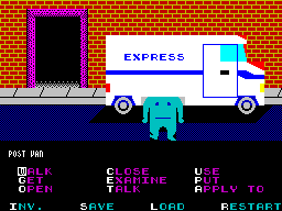 Судя по Postie's Peril, на данный момент главная проблема ZAD — вовсе не графика (повторимся, это вопрос решаемый), а управление. Главный герой ходит по экранам, повинуясь синклер-джойстику, а чтобы вызвать привычный для таких игр курсор, нужно нажать одну из «управляющих» клавиш: «G» для Get, «E» для Examine, «O» для Open, «C» для Close и так далее.