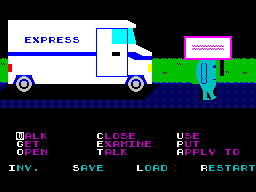 Перемещается курсор тоже с помощью синклер-джойстика, но клавишей выбора действия почему-то назначена Enter, а не привычная «0». И если это несложно починить, то что делать с разросшимся списком глаголов, большинство из которых можно без проблем заменить на обычное «Использовать»? Зато с чувством юмора у товарища всё в порядке — к примеру, в игре есть тёмная аллея, где ни черта не видно, и только какой-то странный товарищ предлагает главному герою всякие гадости: то посмотреть на труп, то купить наркотики, то обзавестись Commodore 64.