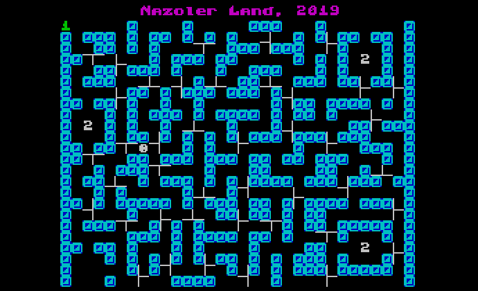 Версия Дмитрия называется Nazoler Land и, по утверждению автора, немного отличается от оригинала, хотя выглядит очень похоже. Скачать игру можно с нашего сайта или с форума «Кодинг для Спектрум и 8бит». Туда же следует писать об ошибках и глюках, если такие найдутся.